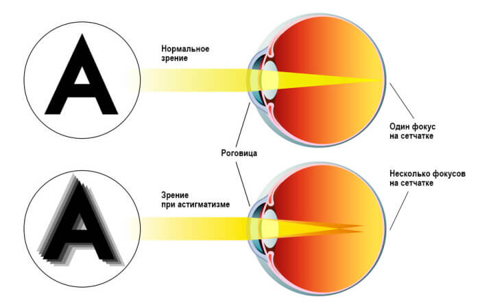 У результаті замість нормального зображення виходить щось деформоване та нечітке. Людина, що страждає на астигматизм, однаково погано бачить як близькі, так і віддалені предмети. Назва «астигматизм» походить від грецького слова stigma, точка, перша літера «а» в цьому слові означає заперечення, тобто це захворювання, коли на сітківці ніколи не формується чітке зображення предмета.